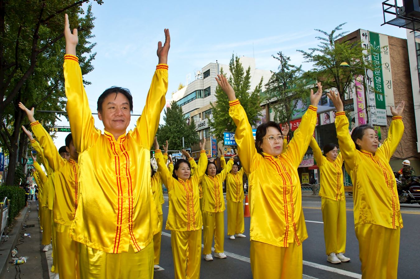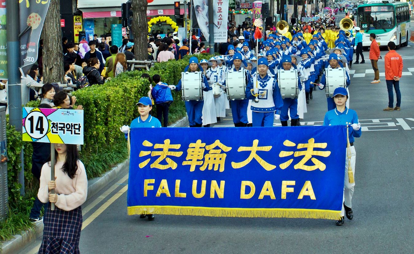 当天下午三点开始的富川市一年一度的庆典游行队伍当中,身穿蓝白相间的唐服的天国乐团和身穿金黄色服装的炼功队尤其受到瞩目。他们所到之处,赢得现场民众一阵阵热情的掌声,人们还纷纷拿出手机拍照、录像。