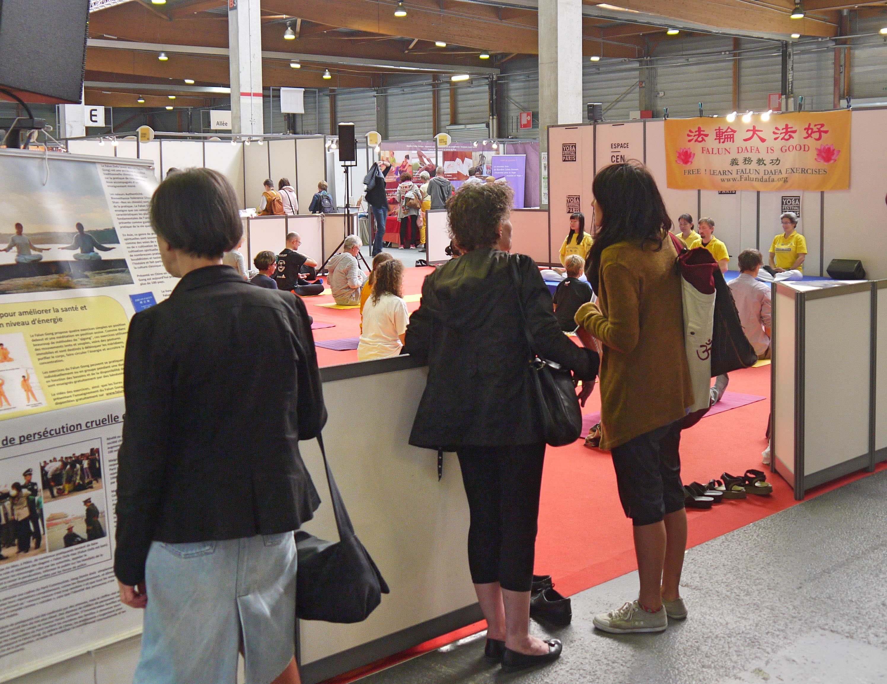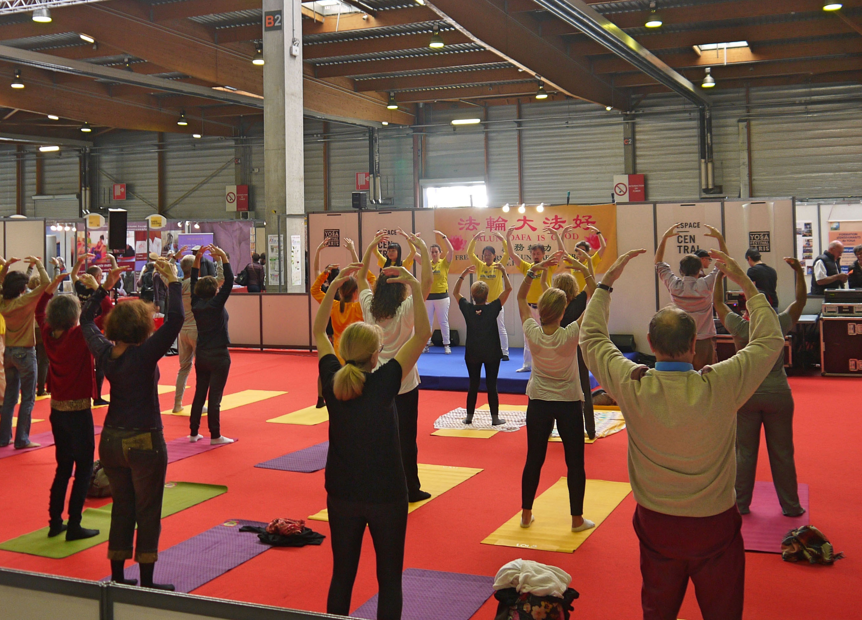 位于巴黎环城高速公路维莱特门(Porte de la Villette)的巴黎活动中心(Paris Event Center),上午十一点,展示会大门刚刚打开,人们纷纷涌进展示会中心场地,随着祥和的法轮功炼功音乐,法轮功学员介绍、演示法轮功功法的同时,也教来宾炼功。