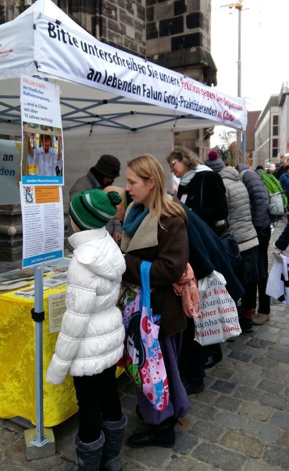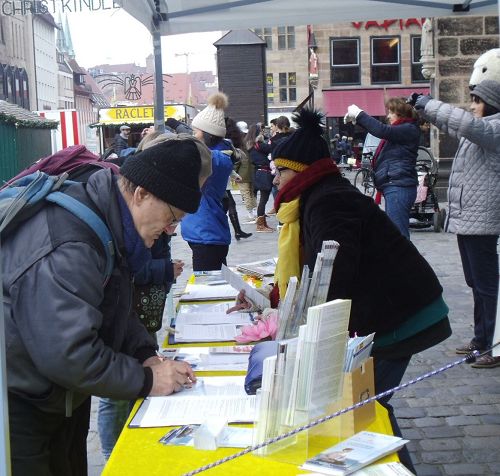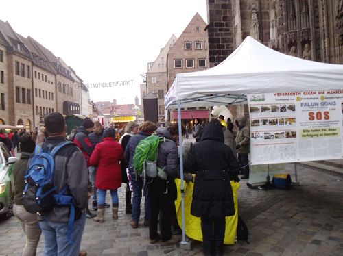 【明慧网二零一七年十一月二十四日】德国的十一月进入冬季,寒冷中纽伦堡与周边地区的法轮功学员一如既往的在市中心举办每月一次的揭露中共迫害、讲清真相活动。越来越多的民众走近法轮功,更多了解法轮功是什么。而共产党十八年来对法轮功的残酷迫害,再一次警醒人们,共产党的邪恶本质从来没有改变。