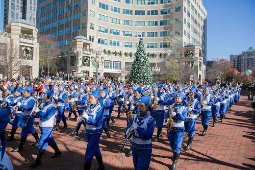 图1~5:二零一七年十一月二十四日,美国弗吉尼亚州瑞思顿(Reston)镇举办节日游行,有约一百五十名法轮功学员组成的天国乐团首次参加。游行主办方表示感谢,两旁观众欢迎。维州瑞斯顿市民 Sarah Happel说:“他们的服装、帽子,一切都那么好,音乐也很动听。真是非常棒﹗”