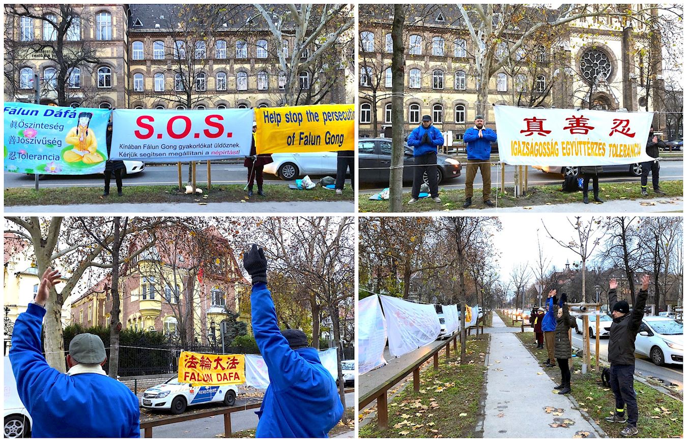 法轮功学员们手持“帮助停止迫害法轮功”、“法轮大法”、“真善忍”等大横幅,在中使馆对面和平表达诉求。抗议活动受到了多家媒体的高度关注,现场做了拍摄和采访。近十家大的匈牙利报纸和电视台(如,Index,444,Nepszava,Blikk,Amerikai Nepszava,Hirtv,Atv等)报导了这个和平的抗议活动。