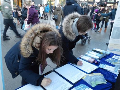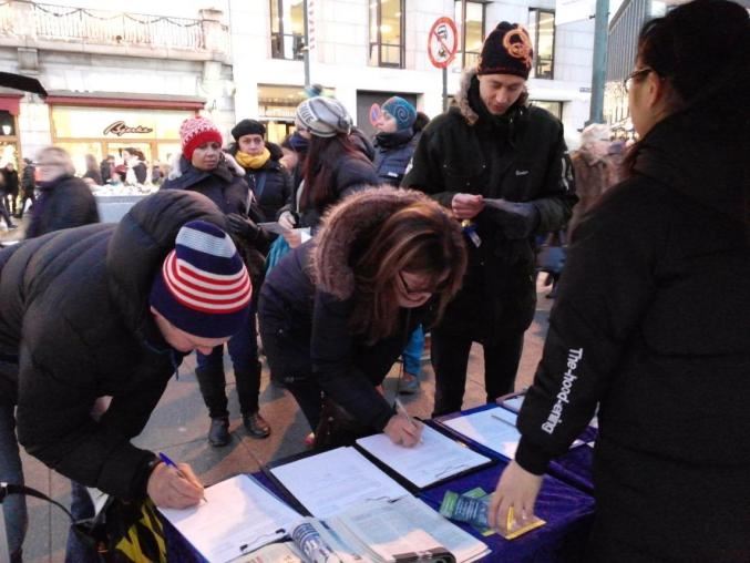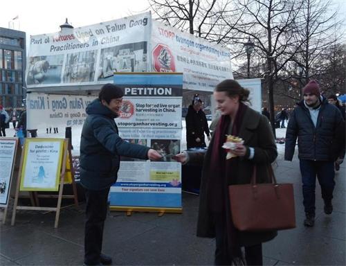 挪威法轮功学员也在这期间继续在首都奥斯陆最热闹繁华的卡尔约翰大街摆设展位。他们不顾冬季的寒冷,满怀热情地向来来往往的行人发放传单,讲述十八年来中共残酷迫害法轮功的事实真相。