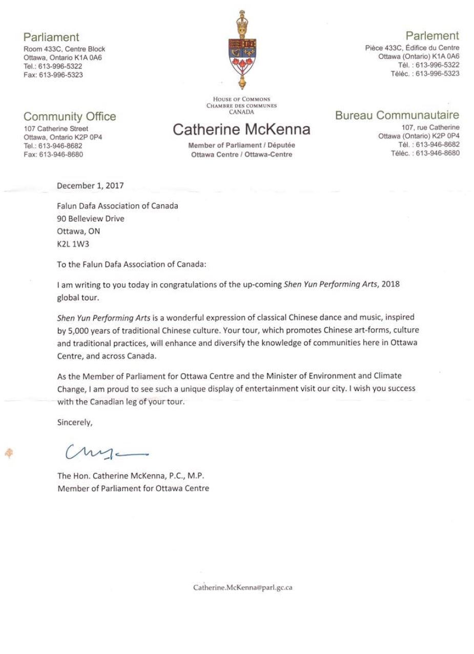 联邦环境部长、自由党国会议员麦克纳(Catherine McKenna)对2018年即将到来的神韵巡演表示祝贺。