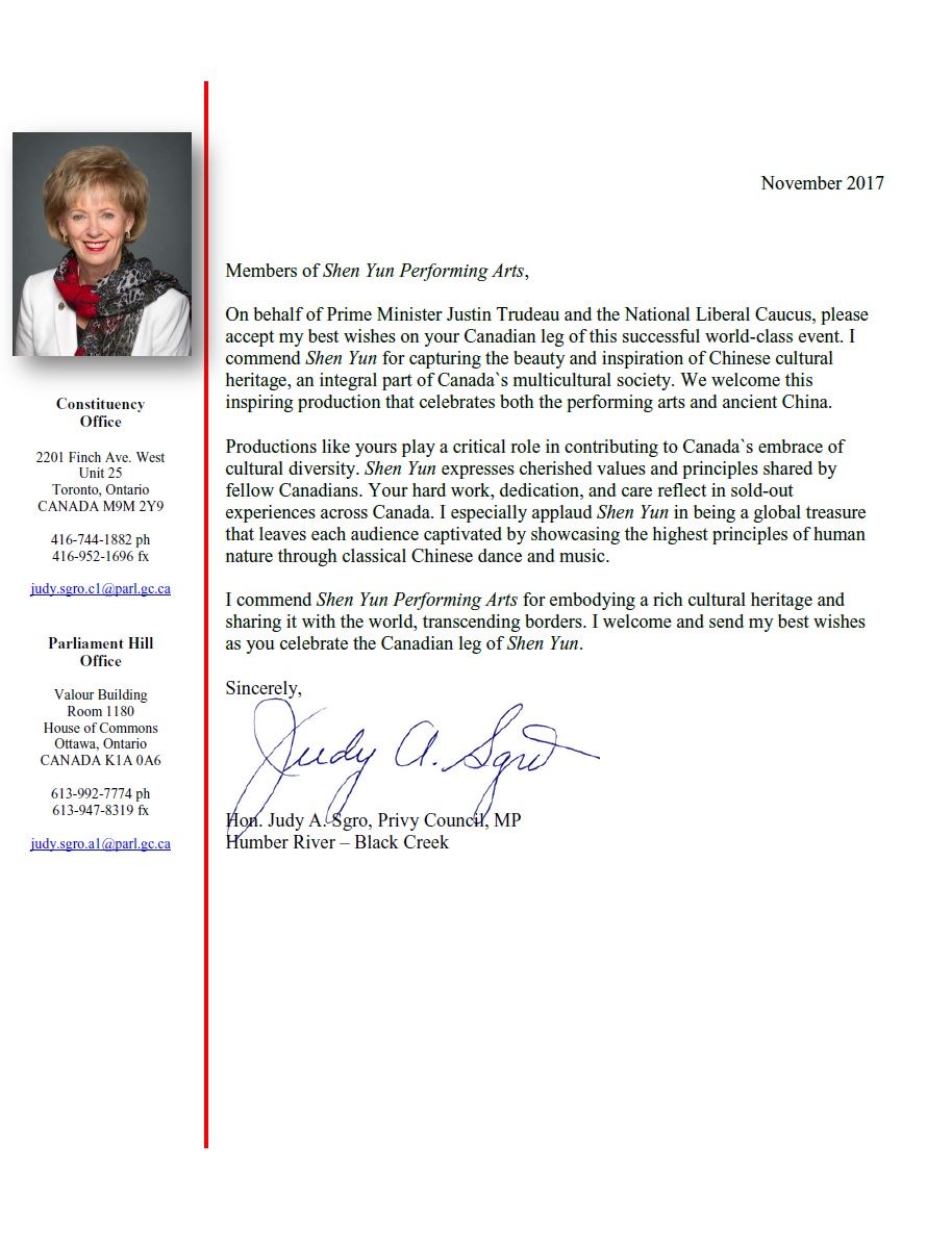 曾任联邦移民部长、自由党国会议员多年的朱迪·思格若(Judy Sgro)每年都为神韵巡演发出贺信。在今年的贺信中,思格若议员写道:“谨代表总理贾斯廷·特鲁多(Justin Trudeau)和自由党全国党团会议,请接受我对这场成功的国际盛事加拿大旅程的最美好祝愿。”