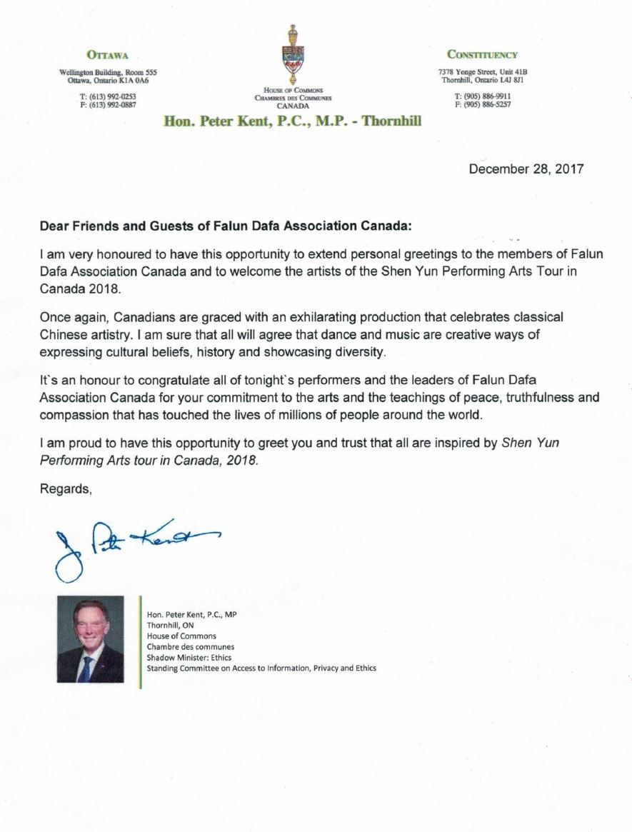 每年为神韵发出贺信的前联邦部长、资深国会议员、国会法轮功之友主席彼得·肯特(Peter Kent)在今年的贺信中写道:“我非常荣幸能有机会向加拿大法轮大法学会表达问候,并欢迎2018年来加拿大巡演的神韵艺术团艺术家们!”