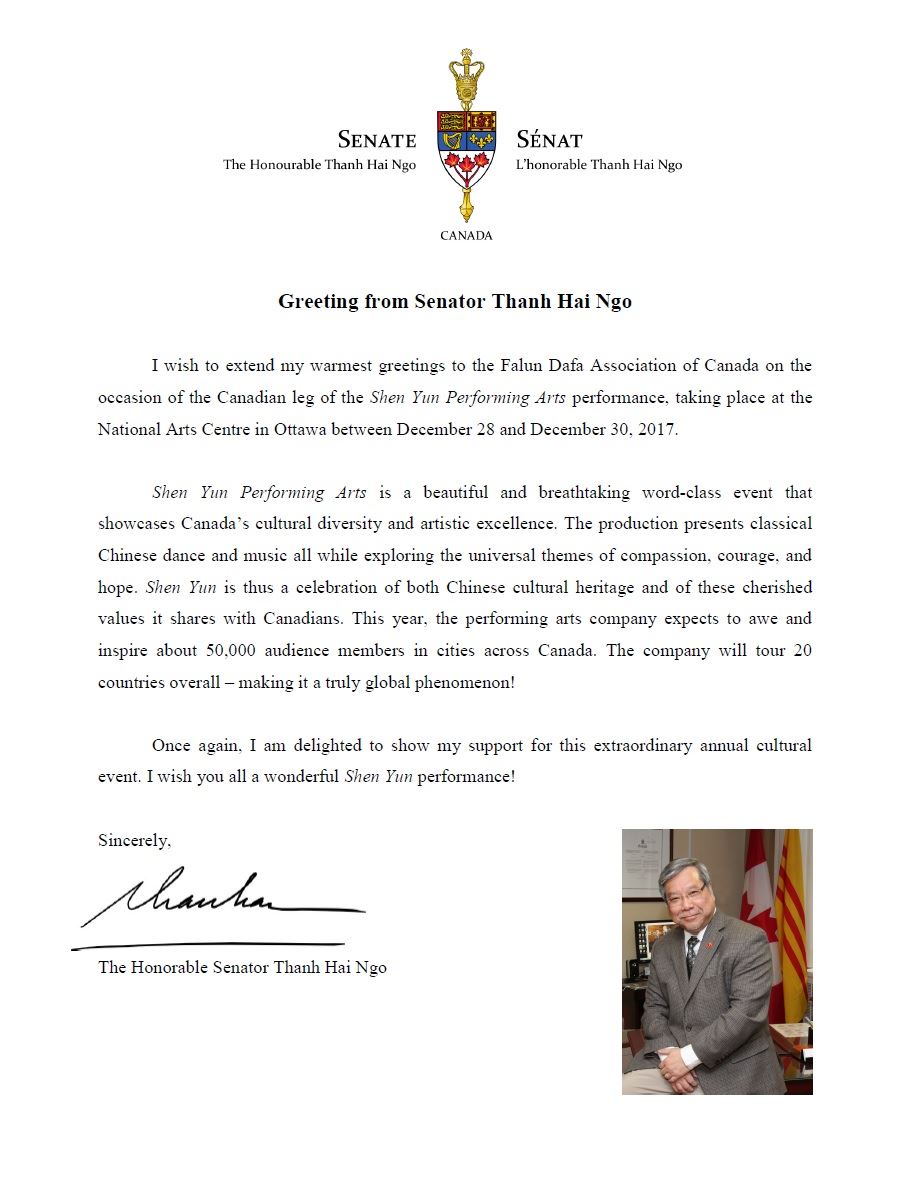 联邦参议员吴蓝海(Ngo ThanhHai)在给神韵的贺信中写道,在神韵艺术团开启加拿大巡演之际,“我要向加拿大法轮大法学会表达我最热情的问候!”