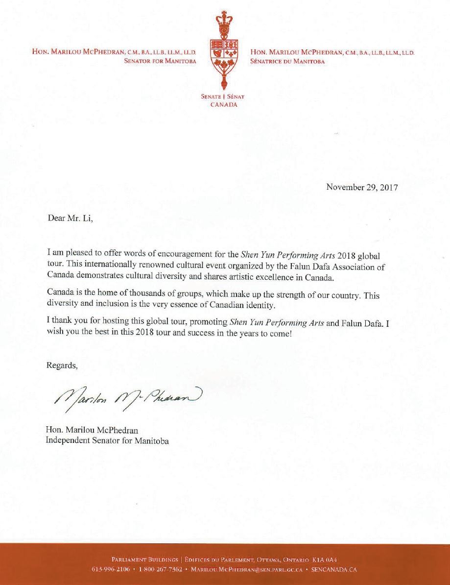 联邦参议员马里洛斯·麦克菲德兰(Marilou McPhedran)在给神韵的贺信中说,她非常高兴能有机会写贺信为神韵2018年全球巡演鼓劲。