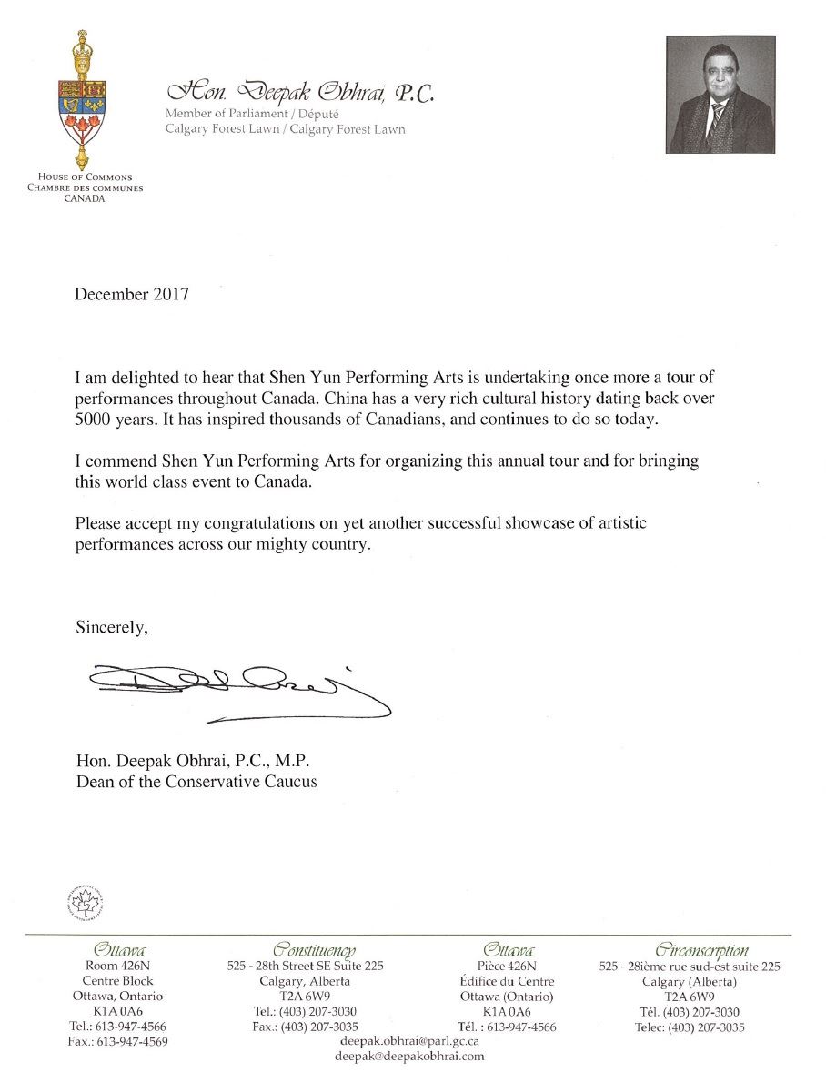 曾数次为神韵巡演发出贺信的联邦保守党资深国会议员迪帕克·奥博拉(Deepak Obhrai)在今年的贺信中表示,神韵艺术团再次莅临加拿大各大城市巡演,让他欣喜不已。