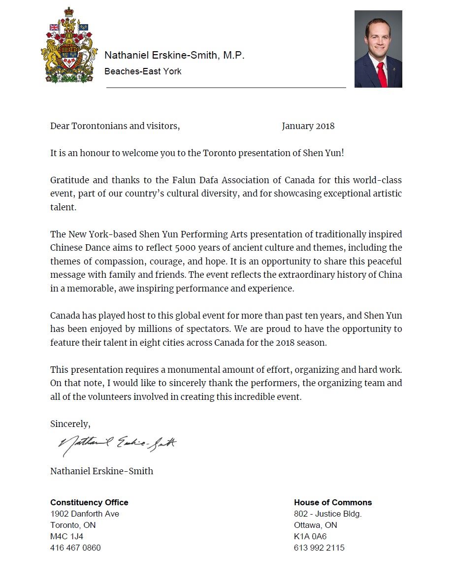 自由党国会议员厄斯金·史密斯(Nathaniel Erskine-Smith)在贺信中表示,“很高兴自己能有幸向观赏神韵的多伦多民众表达问候。”
