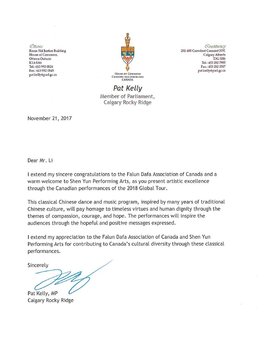 联邦保守党国会议员潘特·凯里(Pat Kelly)在贺信中称,在神韵艺术团开启2018年全球巡演之际,“我要向加拿大法轮大法学会表达我真挚的祝贺,欢迎神韵艺术团!”