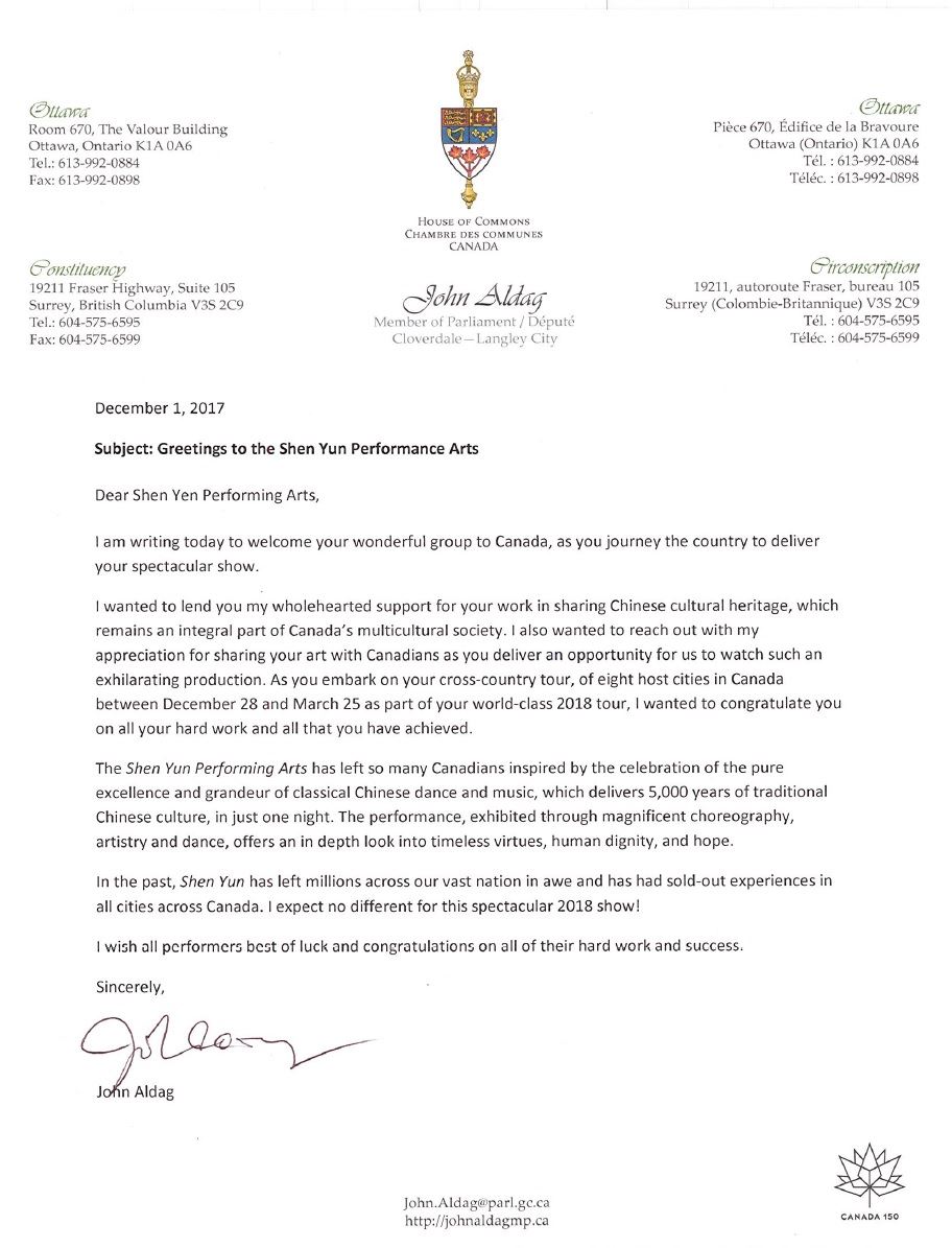 联邦自由党国会议员约翰·艾尔戴格(John Aldag)在贺信中称,欢迎神韵艺术团将这场壮观盛大的演出带到加拿大。