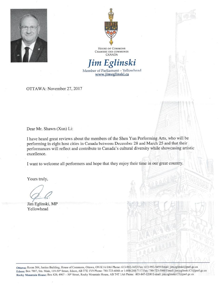 联邦保守党国会议员吉姆·埃林斯基(Jim Eglinski)在给神韵主办方的贺信中称,久闻神韵艺术团大名!神韵艺术团将在加拿大的8个城市演出,“(神韵)将为加拿大的文化多元化做出贡献,同时展现艺术的纯正完美!”