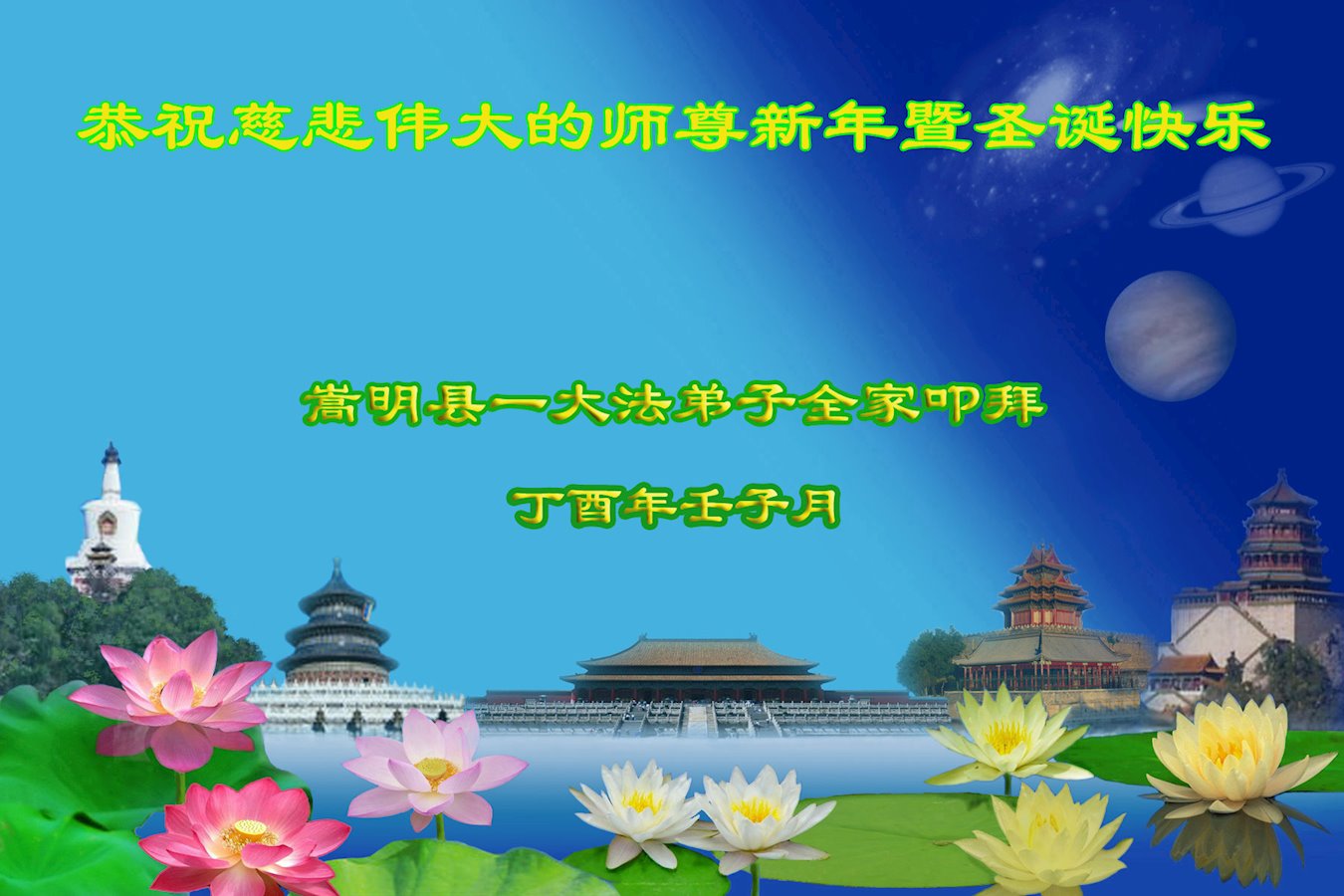 在正法的最后时刻,我们即将迎来新的一年。在此新年来临之际,我们一家八口人恭祝慈悲伟大的师尊新年快乐!
