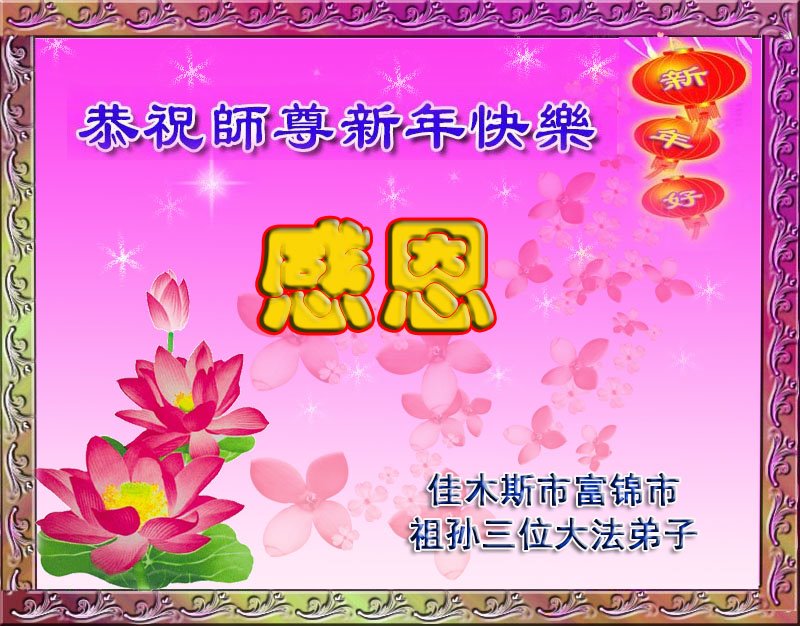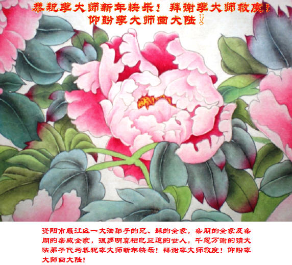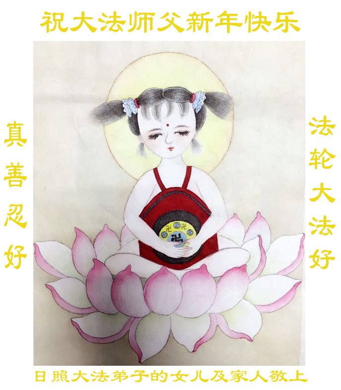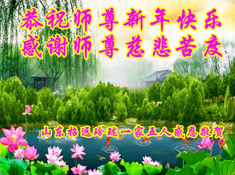 为此在新年到来之际,我们全家七口人心怀无比的恭敬之心,恭祝慈悲伟大的李大师新年快乐!我们会永远记住“法轮大法好,真善忍好”。