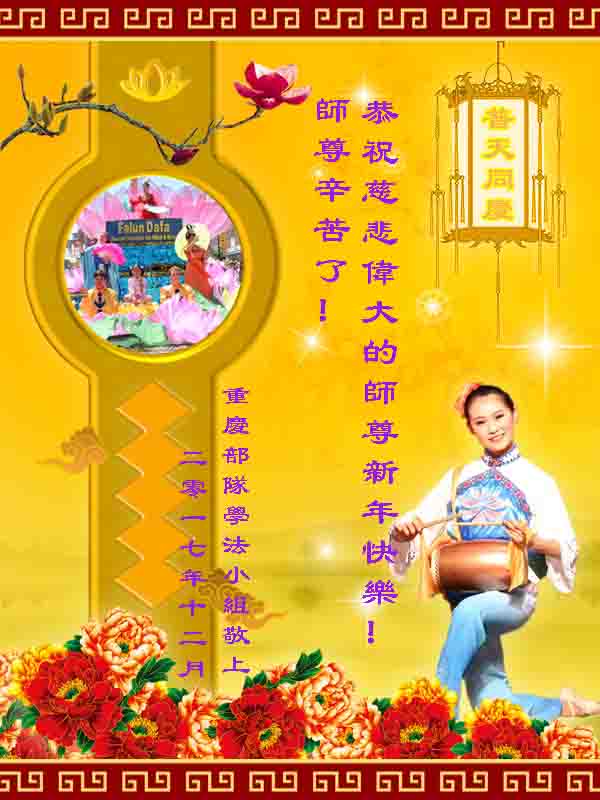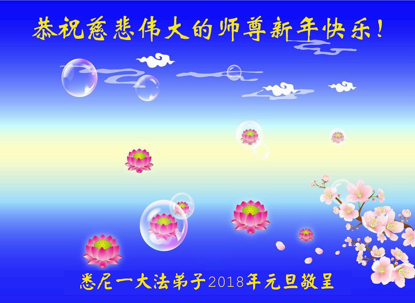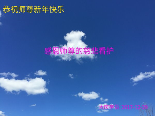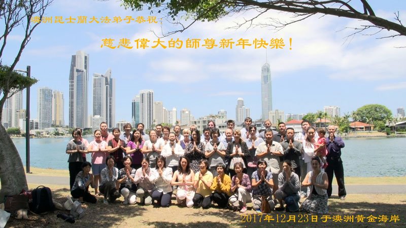 尊敬的师父您好!2018新的一年就要到了,值此辞旧迎新之际,澳洲昆士兰全体大法弟子恭祝慈悲伟大的师父新年快乐!师父您辛苦了!感谢师父的慈悲苦度!我们一定珍惜所剩不多的宝贵时间,更加精進,用心做好“三件事”,不负师父的慈悲苦度,不负众生的殷切期盼,兑现史前大愿。澳洲昆士兰全体大法弟子叩拜师恩!