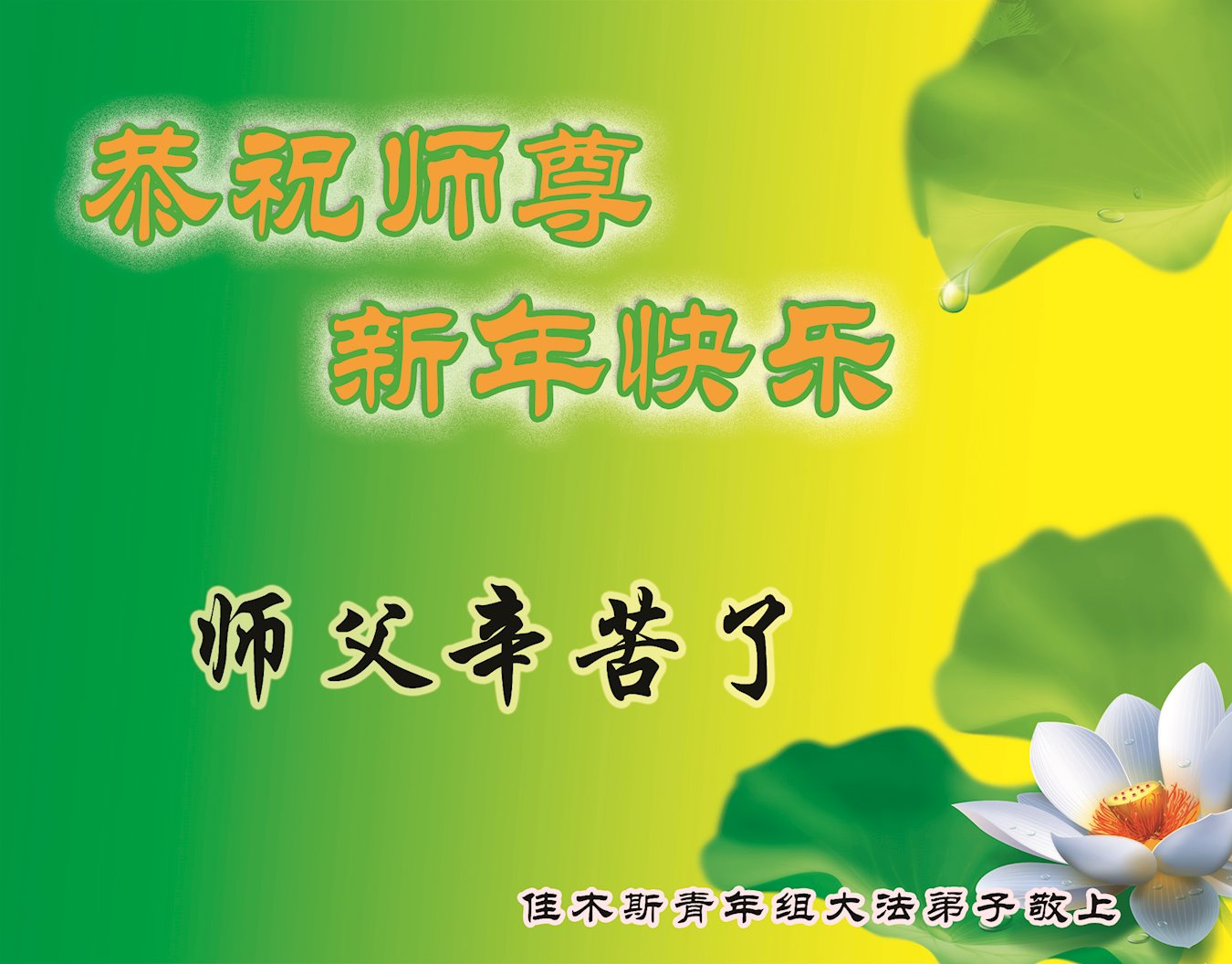 新年即将到来之际,弟子向慈悲伟大的师尊问好,并恭祝师尊新年快乐!弟子在新的一年里会继续努力做好“三件事”,不辜负师父的慈悲苦度!弟子非常想念师父,向师尊合十叩拜。