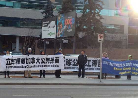 十二月三日,加拿大卡尔加里法轮功学员召开新闻发布会,呼吁访华的加国总理特鲁多帮助营救被中共非法关押的加拿大公民孙茜和十二位加拿大人的亲属。