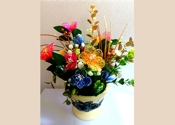 这盆花是云南昆明一名老年法轮大法弟子怀着得法后的愉悦、恭敬的心情,亲手给师父制作的,供奉在师父的法像前,以谢师恩!