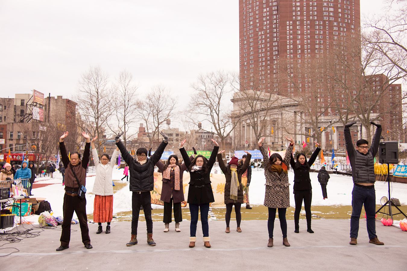 【明慧网二零一七年二月十三日】二零一七年二月十一日是元宵节,是华人的重要传统节日。这天的纽约雪后天晴,法轮功学员再次来到华埠罗斯福公园为当地民众送福,精心准备了舞龙、舞狮、腰鼓、乐器、歌唱等表演,还有法轮功的功法演示。纽约华埠市议员陈倩雯女士为此活动发贺信,赞扬法轮功学员为华埠带来美好的节日活动。