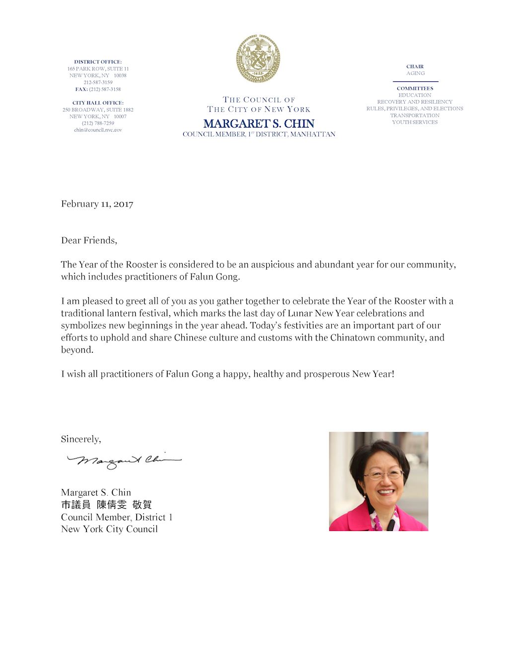 ![]() 图4:纽约华埠市议员陈倩雯女士的贺信,赞扬法轮功学员为华埠带来美好的节日活动。 |