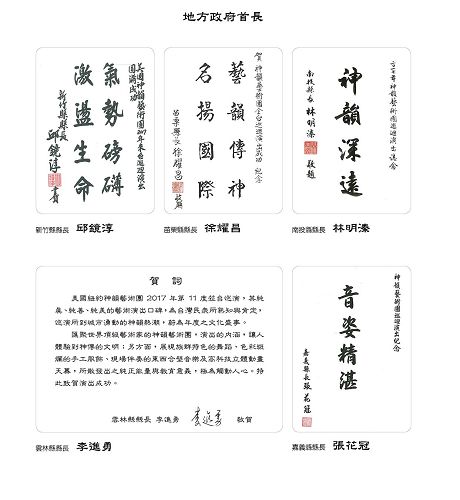 台湾其他县市共十三位地方政府首长,包括基隆市长林右昌、新竹县长邱镜淳、新竹市长林智坚、苗栗县长徐耀昌、南投县长林明溱、云林县长李进勇、嘉义县长张花冠、嘉义市长涂醒哲、屏东县长潘孟安、宜兰县代理县长吴泽成、台东县长黄健庭、澎湖县长陈光复,以及金门县长陈福海和六十二位立法委员(国会议员),纷纷以“神舞飞韵”、“艺臻化境”、“神舞天韵”、“舞艺超群”、“至善至美”、“神韵精湛”、“神乎其技 精妙绝伦”等贺词欢迎神韵莅临。