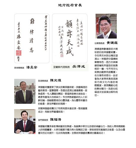 台北市长柯文哲表示:“艺臻化境”。台中市长林佳龙贺词表示,“神乎其技,触动心灵,馀音绕梁,风华再现。来自美国纽约的神韵艺术团以结合东西方优质的音乐与舞蹈,诠释中华传统经典历史故事著称。2017年在台湾的巡回演出,除了将带给民众独树一帜的艺术飨宴,也厚实台中文化城的底蕴。”