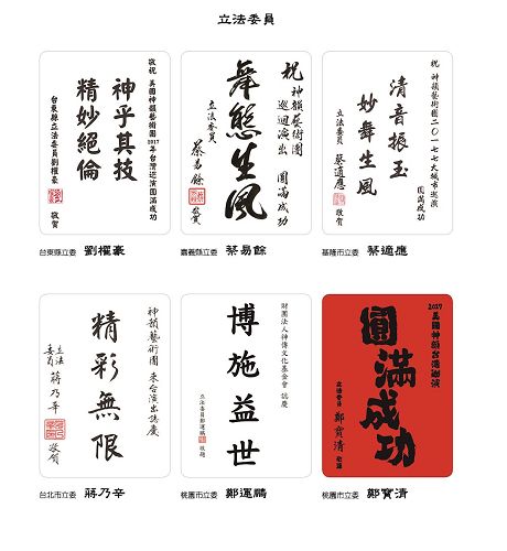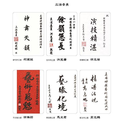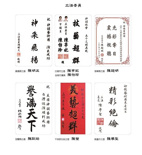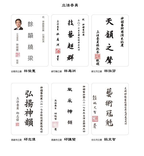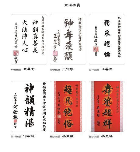 图2:台湾行政院长林全、立法院长苏嘉全、考试院长伍锦霖、立法院副院长蔡其昌贺词赞扬神韵。 |