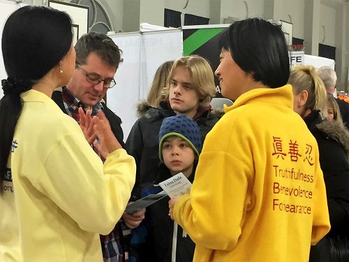在展览会上很多人都在法轮功的展位前停留询问,他们中有年轻人,有退休的老人,有学生,有政府的工作人员等等。在这些参观者中只要路过展位,很少有人不接学员递给他们的传单,甚至有的人拿一张传单还嫌不够,要多拿几张给他们的朋友。