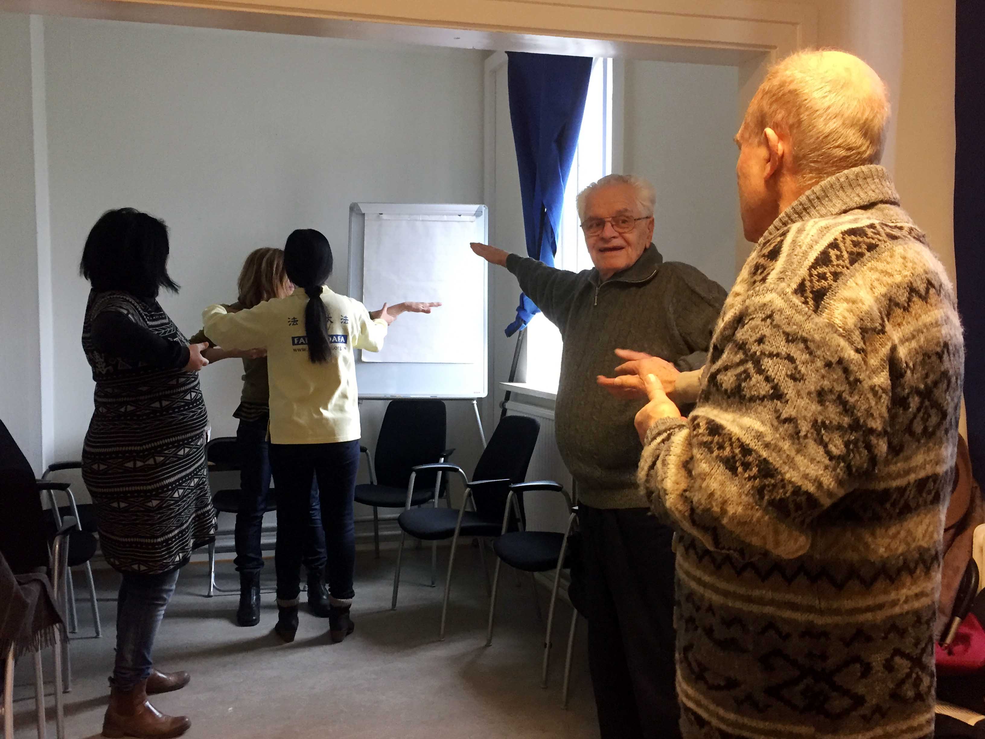 图4:瑞典民众向法轮功学员学炼功法