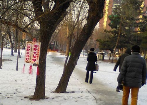 丁酉年正月,在大陆各地,法轮功学员们通过悬挂海报、条幅和树挂,将“法轮大法好”、“真善忍好”传递给当地百姓。