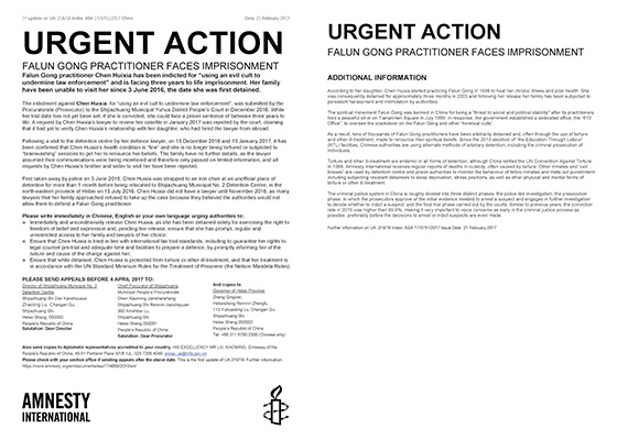 大赦国际组织再次为制止中共迫害法轮功向国际社会发出紧急行动呼吁,对又一名法轮功学员面临中共非法监禁表示强烈关注,要求中共当局立即释放陈慧霞……