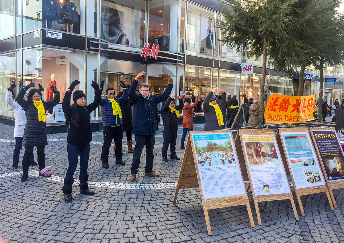 二零一七年三月十一日周六这天阳光明媚,瑞典部分法轮功学员来到音乐厅旁举办法轮大法信息日活动,他们在活动场地挂上“法轮大法好”醒目的横幅、摆上展板、信息台,伴随着炼功音乐,展示法轮功的功法,同时向步行街上来来往往的行人派发传单和征集反活摘器官的签名。