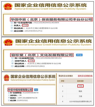 资料显示,华信中安丰台分公司负责人于炜;容珍堂文化发展有限公司法人代表、个人独资于炜;中安中视传媒有限公司股东于炜。即于炜是华信中安丰台分公司的负责人,也是容珍堂美术馆、书画院的实际控制人,这些单位的股东多有交叉,确实是一个利益、工作深度溶合的共同体。