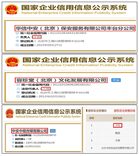 ![]() 图4:华信中安负责人:于炜;容珍堂法人:于炜;中安中视传媒股东:于炜 |