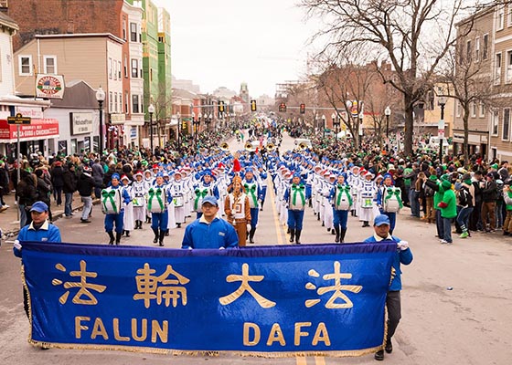 三月十九日,由一百六十多名法轮功学员组成的天国乐团参加了美国波士顿的圣派翠克日游行,成为当日游行活动的亮点。