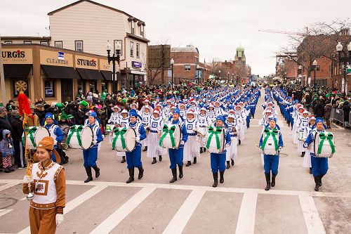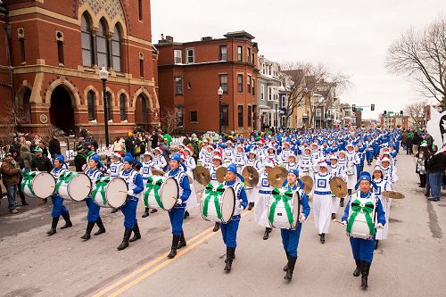 天国乐团自二零零八年起多次受邀参加波士顿圣派翠克日游行,法轮功学员的风范给主办方留下了深刻的印象。尤其是在二零一零年的圣派翠克日游行,遇上大雨滂沱, 许多参加游行的团体临时取消参与游行或提早结束,而法轮功学员却不为恶劣天气所动,从头走到尾,一丝不苟,令主办方极为感动。二零一一年的圣派翠克日游行上,主办方特别安排法轮功团体——天国乐团紧跟领队的波士顿警察队,走在游行队伍的前端。