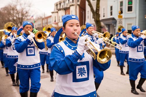 ![]() 图1~5:由一百六十多名法轮功学员组成的天国乐团,在二零一七年波士顿圣派翠克日游行上展英姿。 |