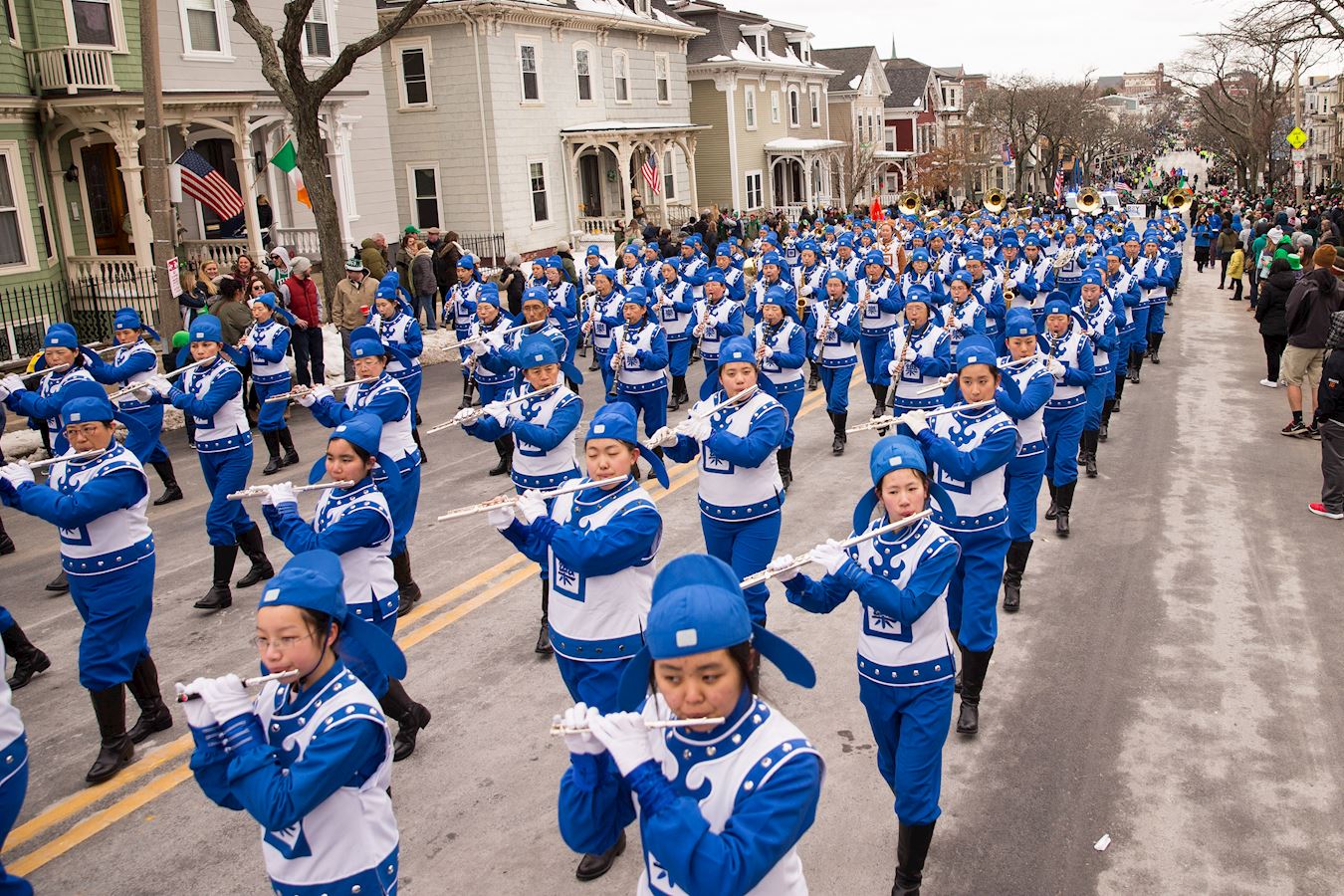 虽然当日天气寒冷,积雪尚未消融,游行庆祝的规模依然盛大,有上百个团体数千人参加游行,数十万民众观礼,当地有线电视台NECN (New England Cable Network,英格兰有线电视网)向美国东北部新英格兰地区六个州约三百七十万用户现场直播游行盛况。