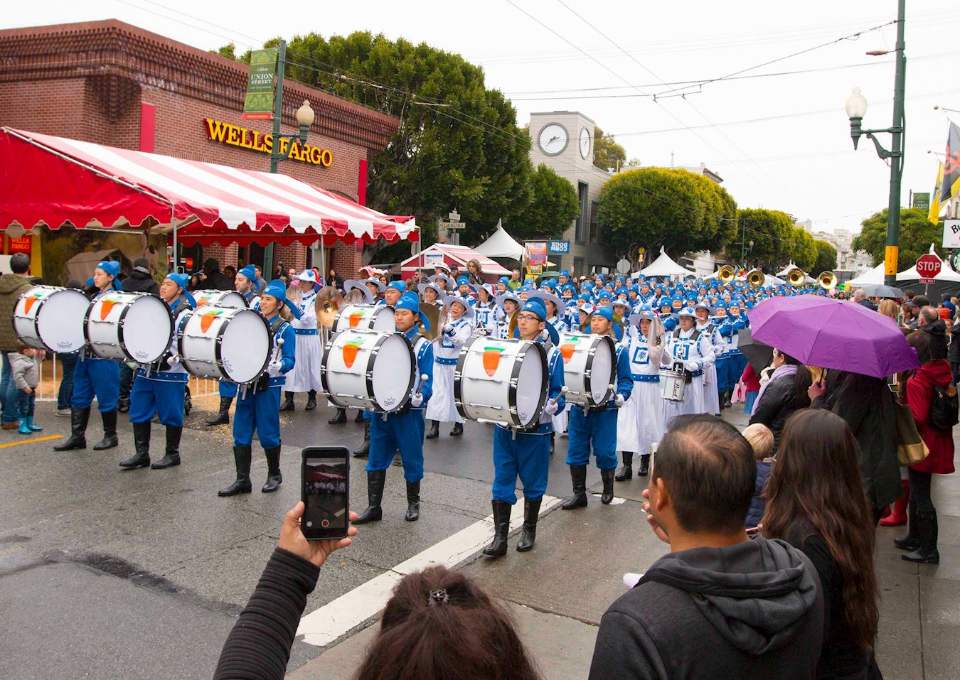 天空中虽然飘着细雨,但挡不住街道两旁热情的观众。他们争睹并欣赏着由法轮功学员组成的美西天国乐团为他们演奏的《法轮大法好》、《神圣的歌》和《星条旗永不落》等乐曲。