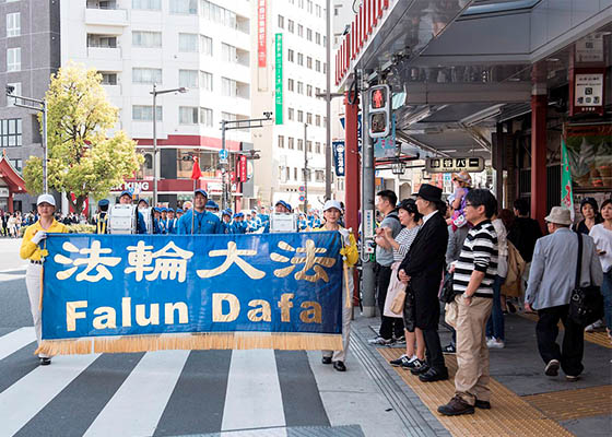 四月十六日,来自日本多个县市的部份法轮功学员,在东京著名的观光景点“浅草寺”附近举行反迫害游行,向民众展示法轮功的美好。
