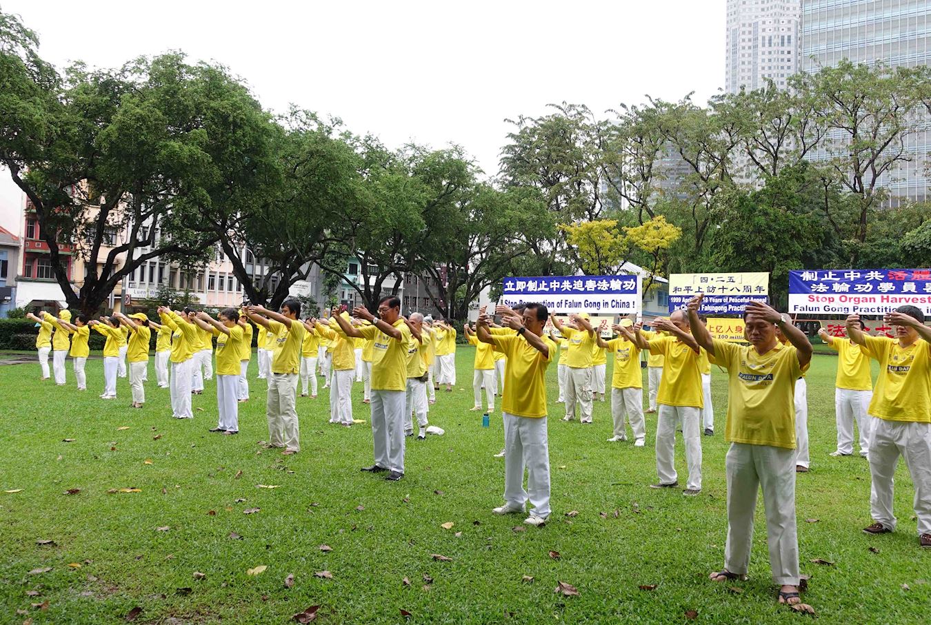 '图1~2:二零一七年四月十八日,新加坡法轮功学员在芳林公园举办活动,纪念“四二五”和平上访十八周年。图为学员们正在集体炼功。'