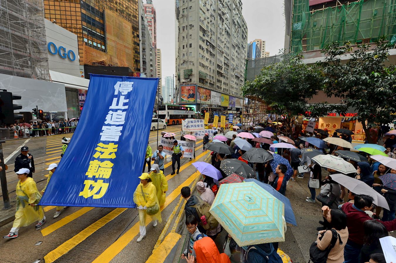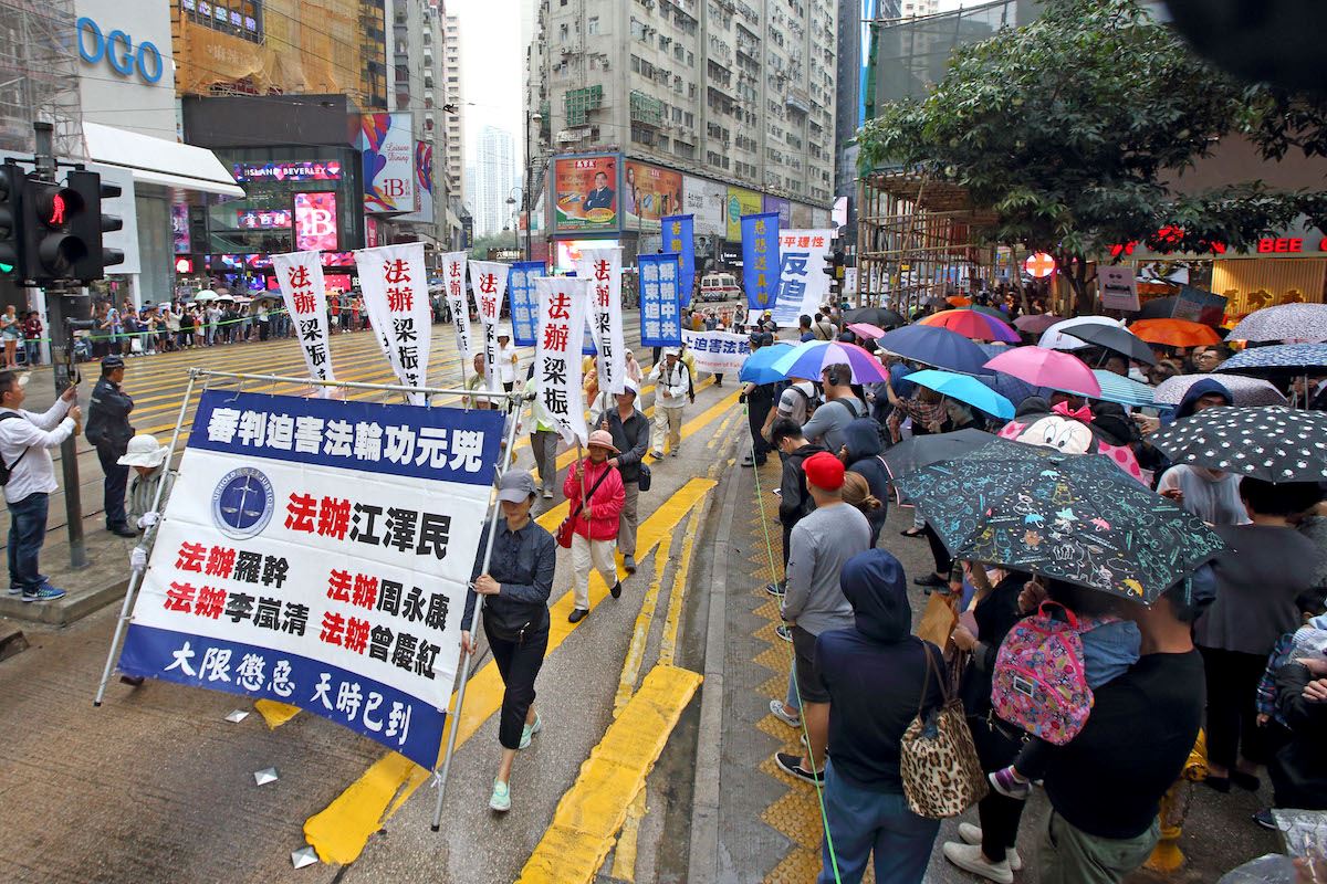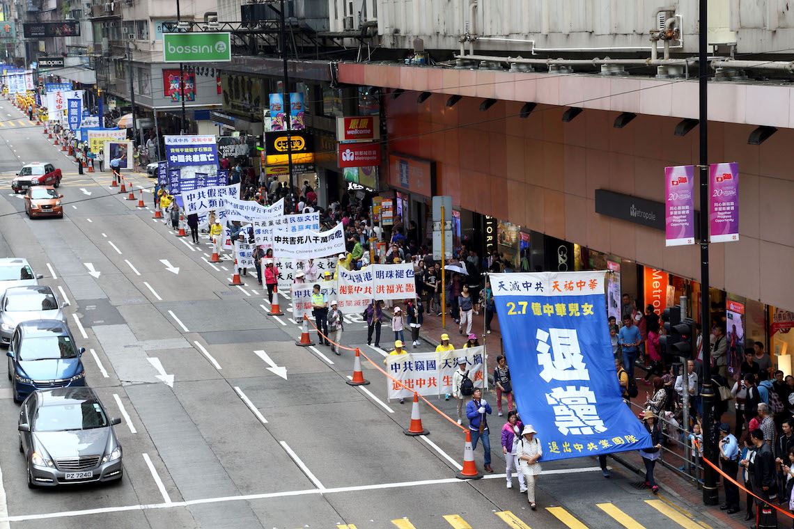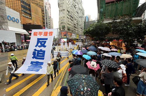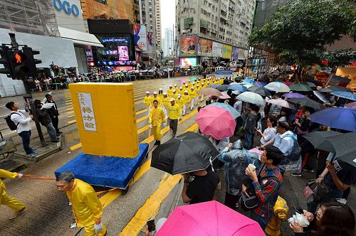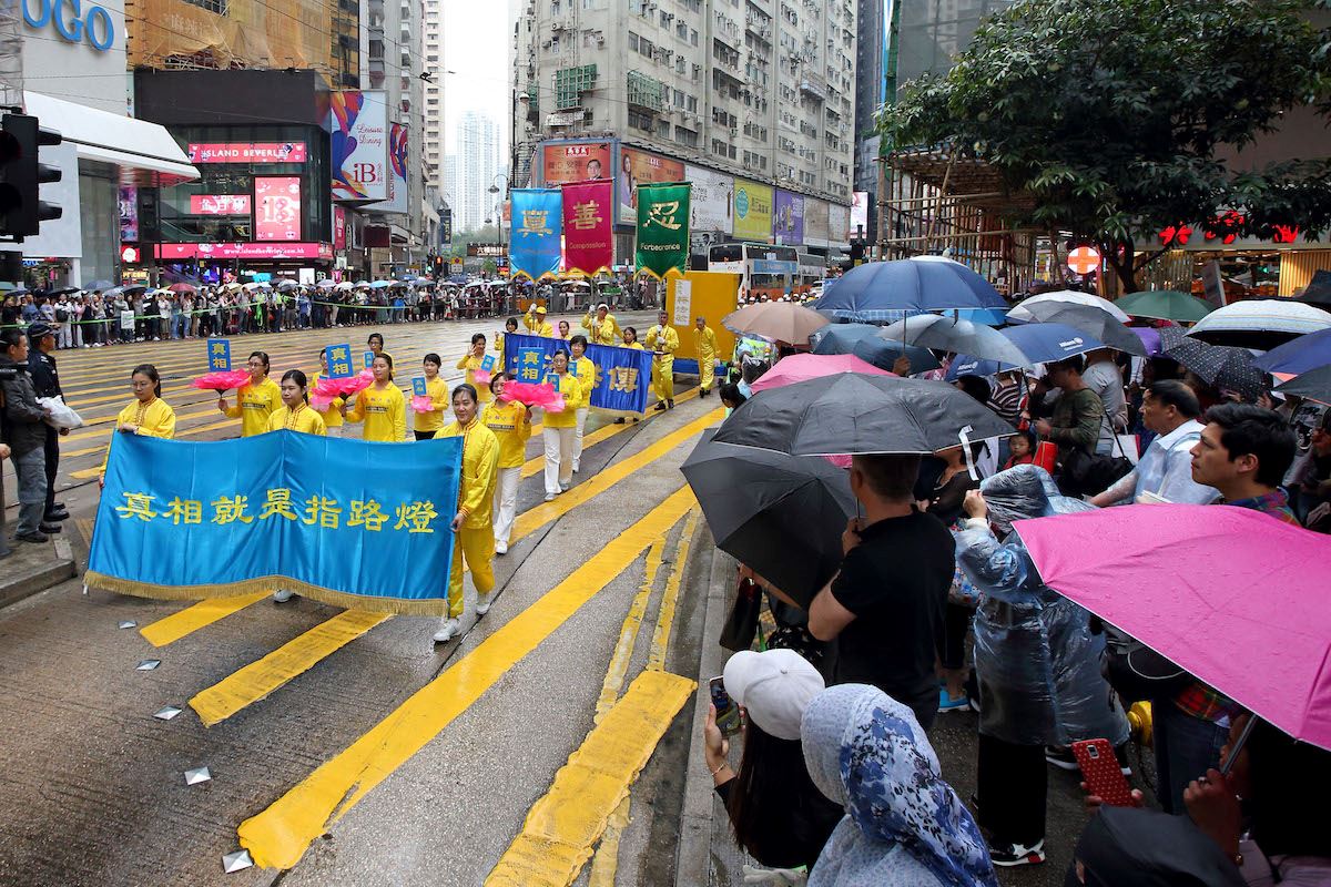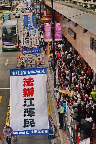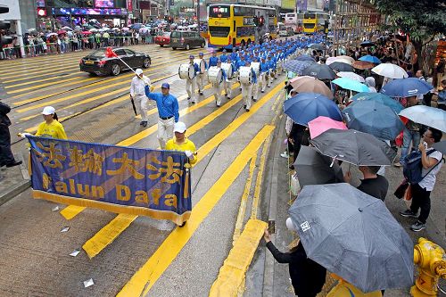 集会结束后,约一千二百名法轮功学员组成游行队伍,于下午二时,在天国乐团演奏雄壮乐曲的带领下,从北角英皇道游乐场起步,沿着港岛多个闹市游行至中联办。各式幡旗、横幅、展板上鲜明的真相,振奋人心的腰鼓队、旗鼓队,在吸引沿途市民与游客关注必驻足观看,不少人拿起手机拍摄游行画面,表示要带回去与亲友分享。
