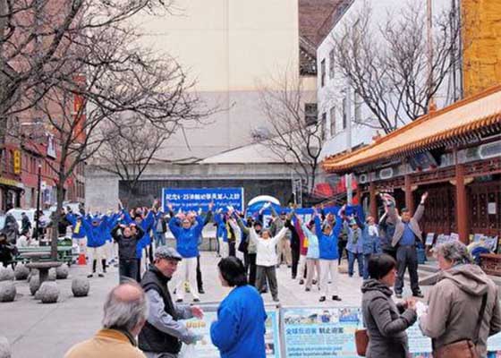 法轮功学员在加拿大蒙特利尔唐人街举行集会和游行,纪念1999年4月25日万名法轮功学员和平上访,并呼吁制止中共对法轮功的残酷迫害。