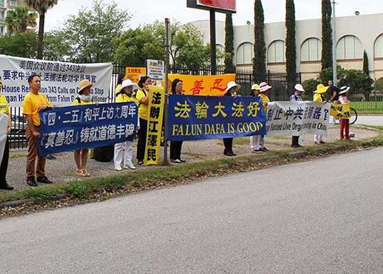 四月二十五日,休士顿市部份法轮功学员在中领馆前集会,纪念万名法轮功学员北京和平上访十八周年。