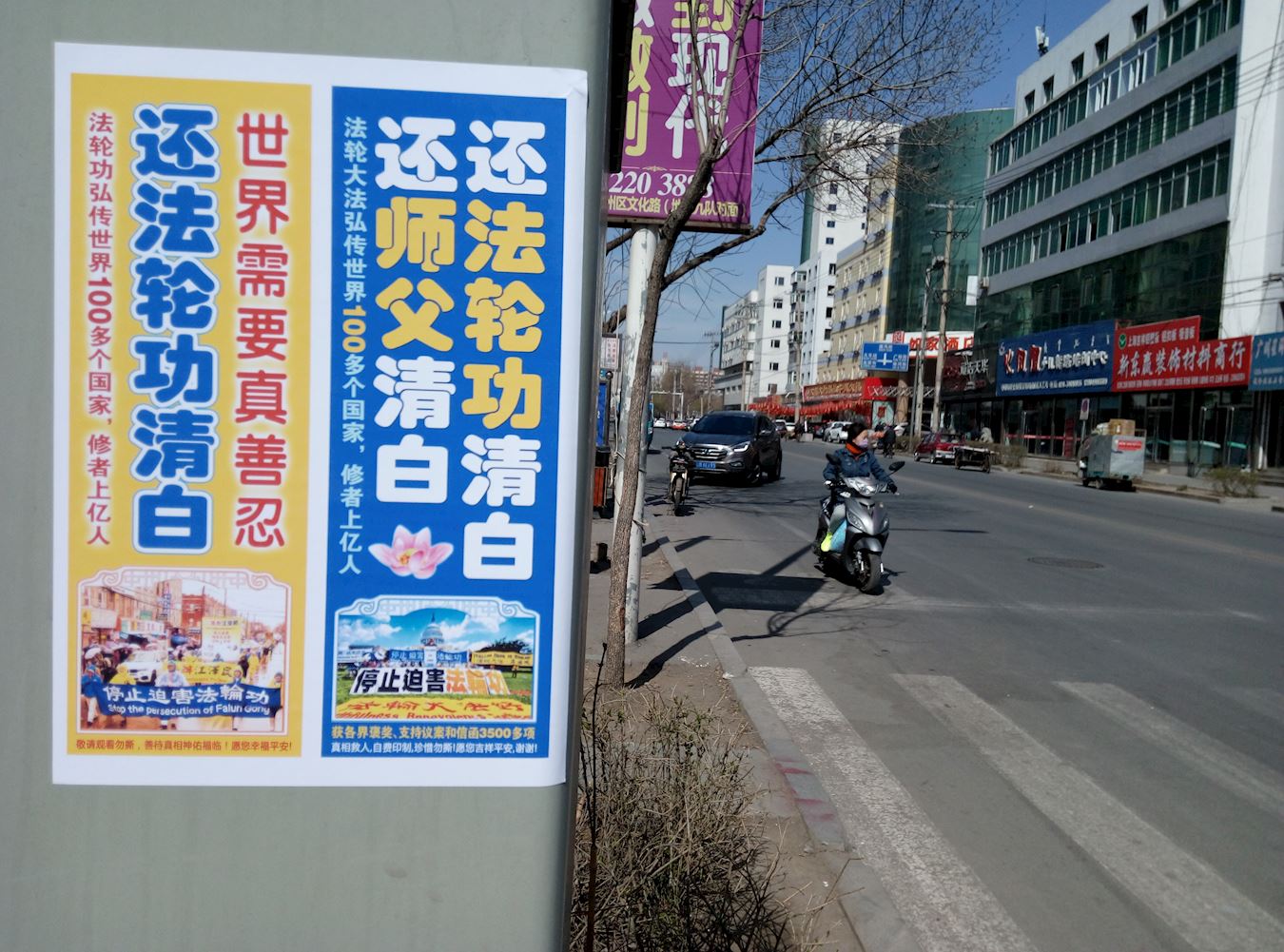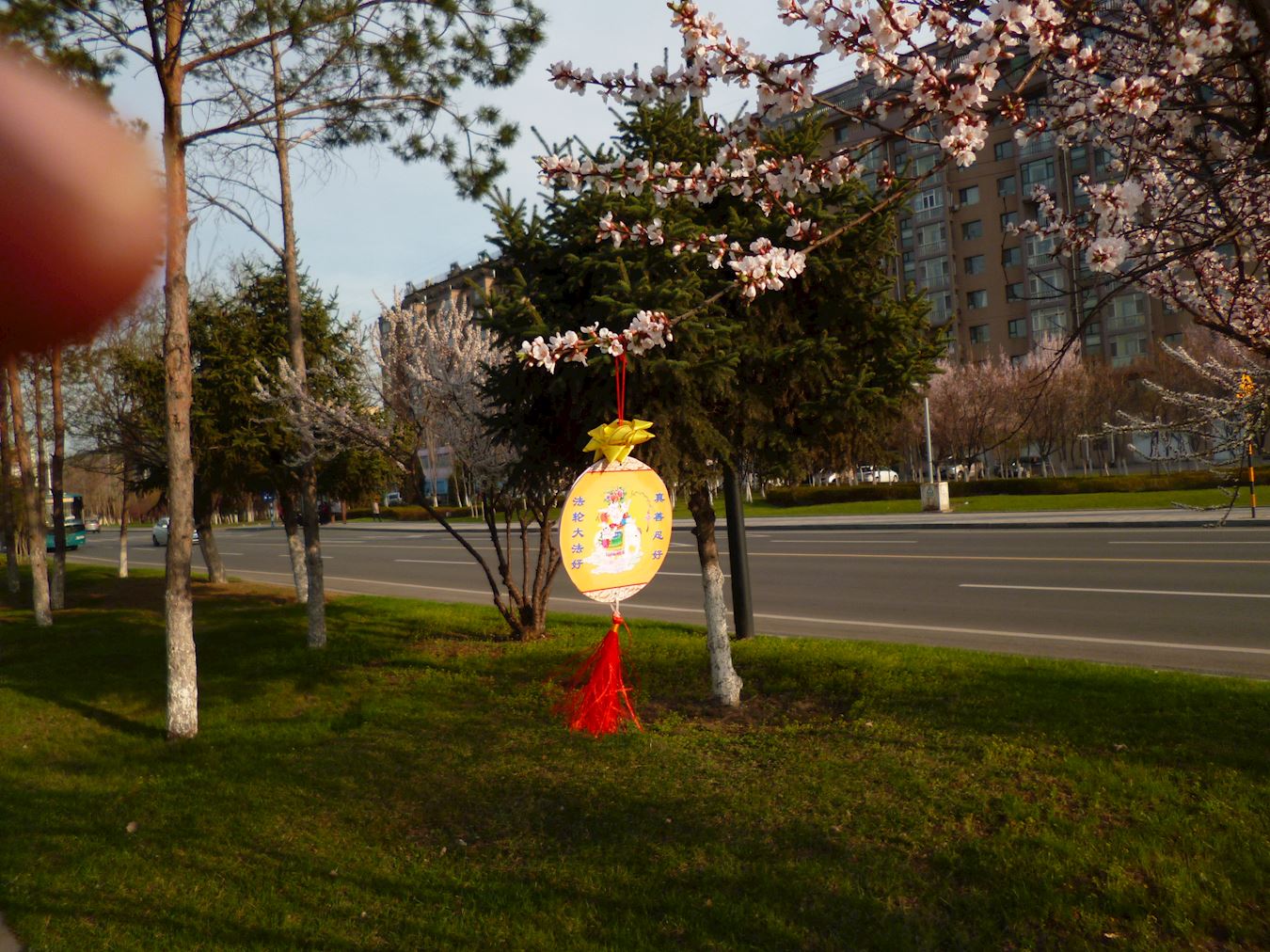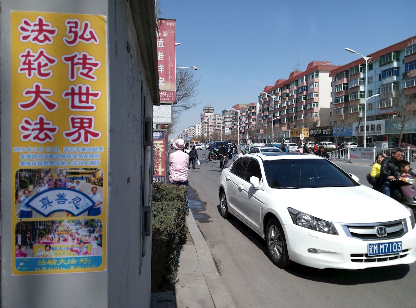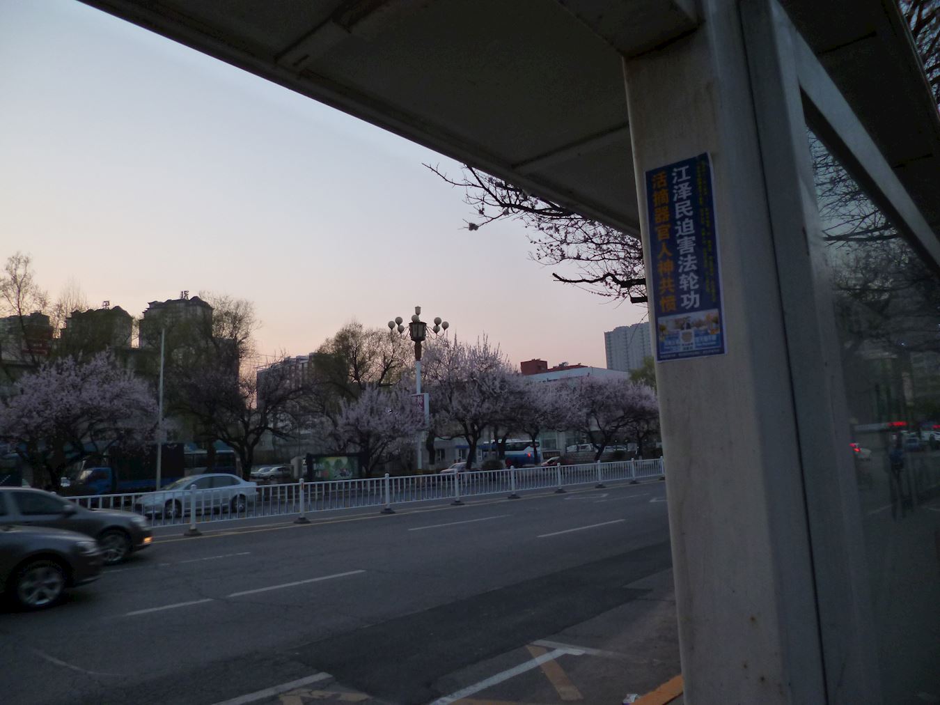 抗议地点因是交通要道,来往车辆络绎不绝。法轮功学员在马路两侧打出“按一下喇叭,为制止迫害法轮功”的牌子,不时有司机减缓车速,看到大横幅上的内容后,或者按喇叭,或者冲学员伸出大拇指。从早晨六点开始,长长短短的汽车喇叭声传进中领馆,表达人们对中共罪行的厌恶,同时提醒里面的人正视门外的抗议。