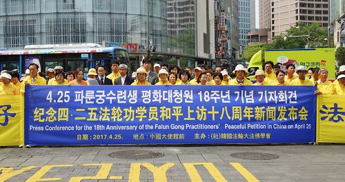 二零一七年四月二十五日上午,韩国法轮功学员在中共驻韩大使馆前召开记者会。社团法人“韩国法轮大法佛学会”发言人吴世烈在记者会上介绍,法轮功是以 “真、善、忍”为准则,并辅以简单的五套功法来修炼的性命双修功法。在一九九九年四月二十五日前,中国法轮功修炼者人数达上亿人。由于炼功者的人数远远超出当时的共产党员的人数,引起了独裁中共的妒忌,尽管中共的宪法赋予人民有信仰自由的权利,但是迫害元凶——中共前党魁江泽民却一意孤行,发动了血腥迫害,至今十八年。