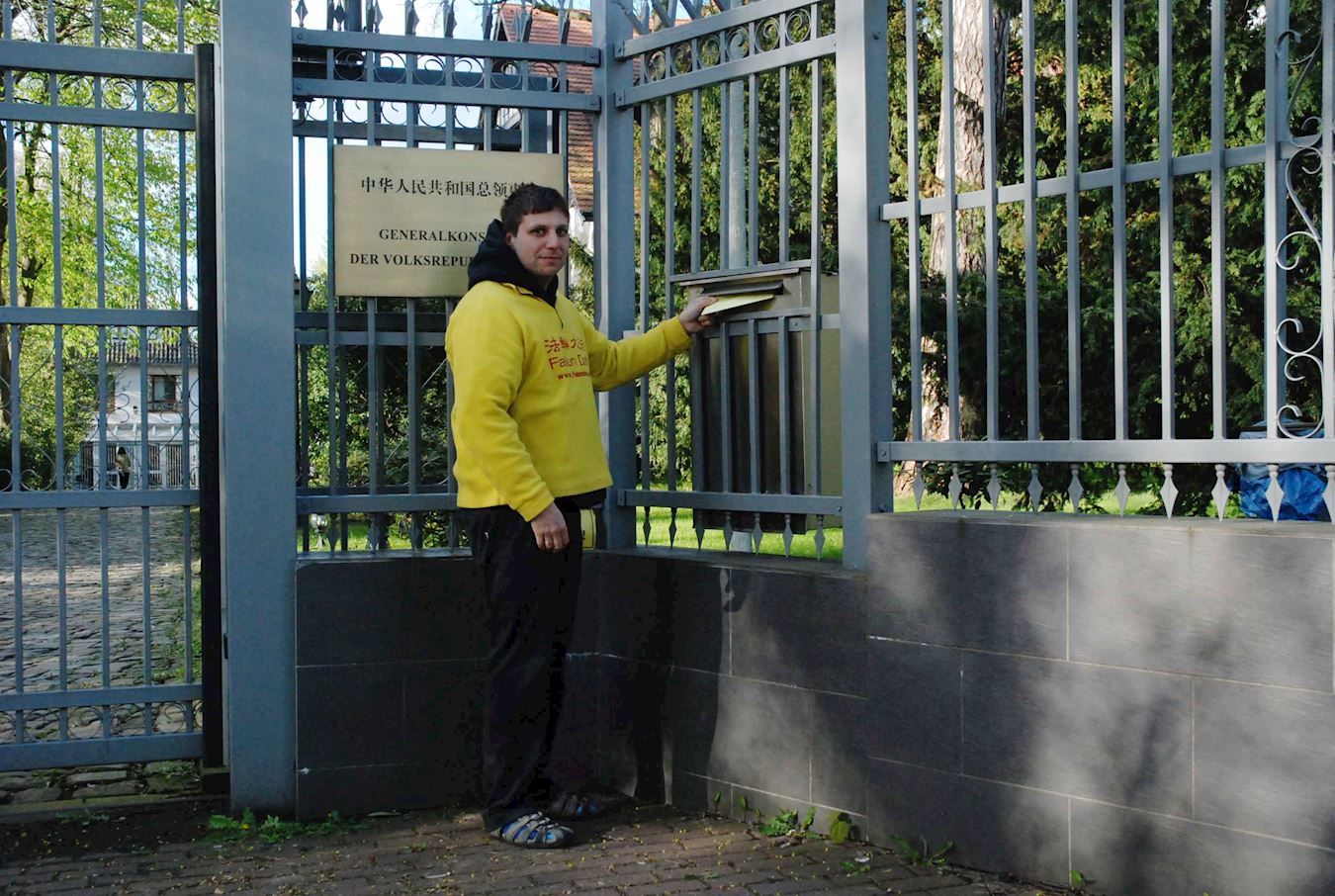 下午六时左右,两位法轮功学员按领事馆门铃,希望能与工作人员面谈,告知法轮功真相,然而多次按门铃后没有任何回应,于是一法轮功学员读了写给总领事孙从彬的公开信后,将信投入领馆邮箱。
