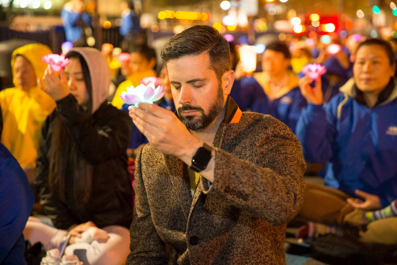 夜幕下,一盏盏烛光被点亮,被学员们举过头顶,捧在胸前,纪念着那些被中共迫害致死的法轮功修炼者。