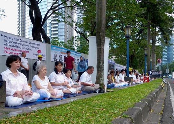 四月二十五日,印尼雅加达法轮功学员们在中使馆对面静坐,纪念“四二五”和平上访十八周年。