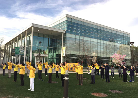 四月二十五日,法轮功学员们在韦恩州立大学校园中心的喷泉角,以集体炼功和发法轮功真相资料的方式纪念“四二五”这个重要的日子。